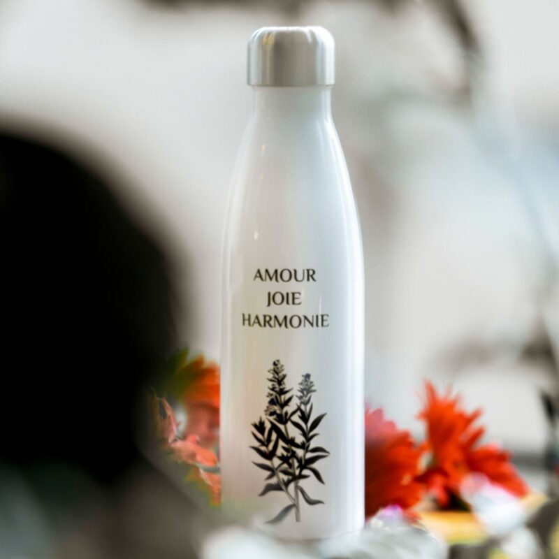 Cette bouteille en acier inoxydable incarne les trois piliers de l’être humain selon l’Ayurveda : Amour, Joie, Harmonie, pour une expérience enrichissante.