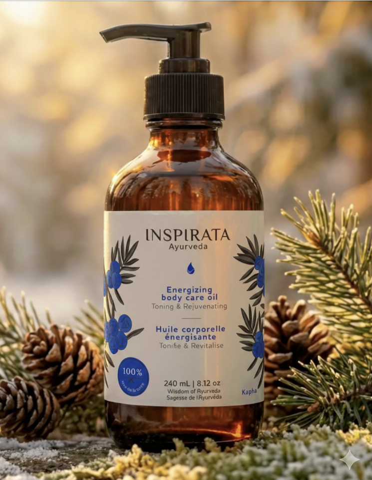 Si vous trouvez que vous avez la légèreté d’un éléphant au réveil, notre huile corporelle énergisante KAPHA est là pour alléger votre journée avec sa fraîcheur revigorante! Cette huile est idéale pour l’automassage (abhyanga) matinal, en massage actif pour hydrater et activer la circulation. Elle contient un mélange de plantes tonifiantes qui stimulent et aident à se mettre en action. Une belle manière de commencer sa journée avec énergie. Romarin, poivre noir, génévrier sont des vedettes de ce mélange unique!